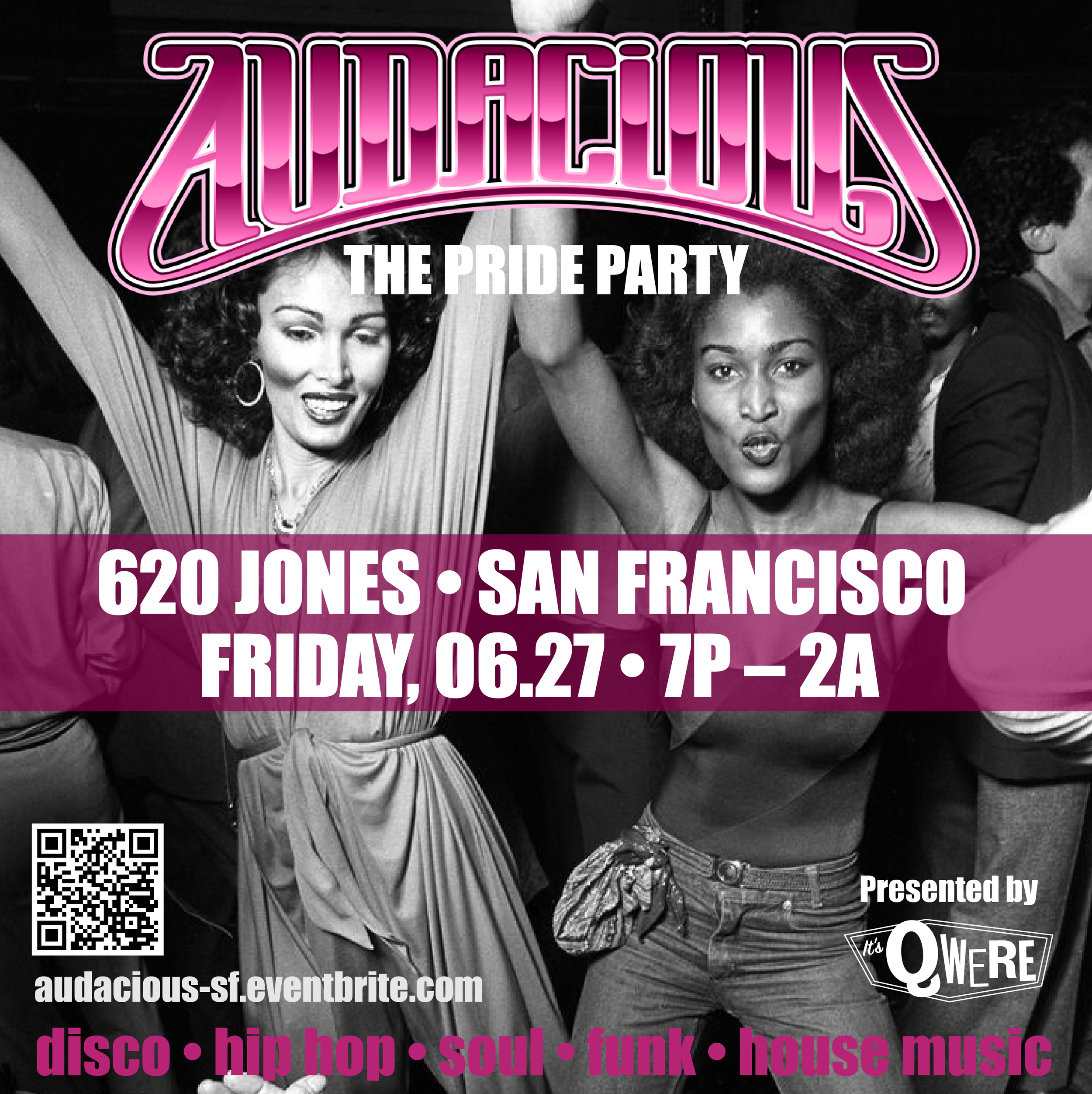 We’re popping our nightlife cherry! Audacious San Francisco features disco, funk, soul, hip-hop, and house music. Ages 30+ recommended. Grab Presale tickets now.